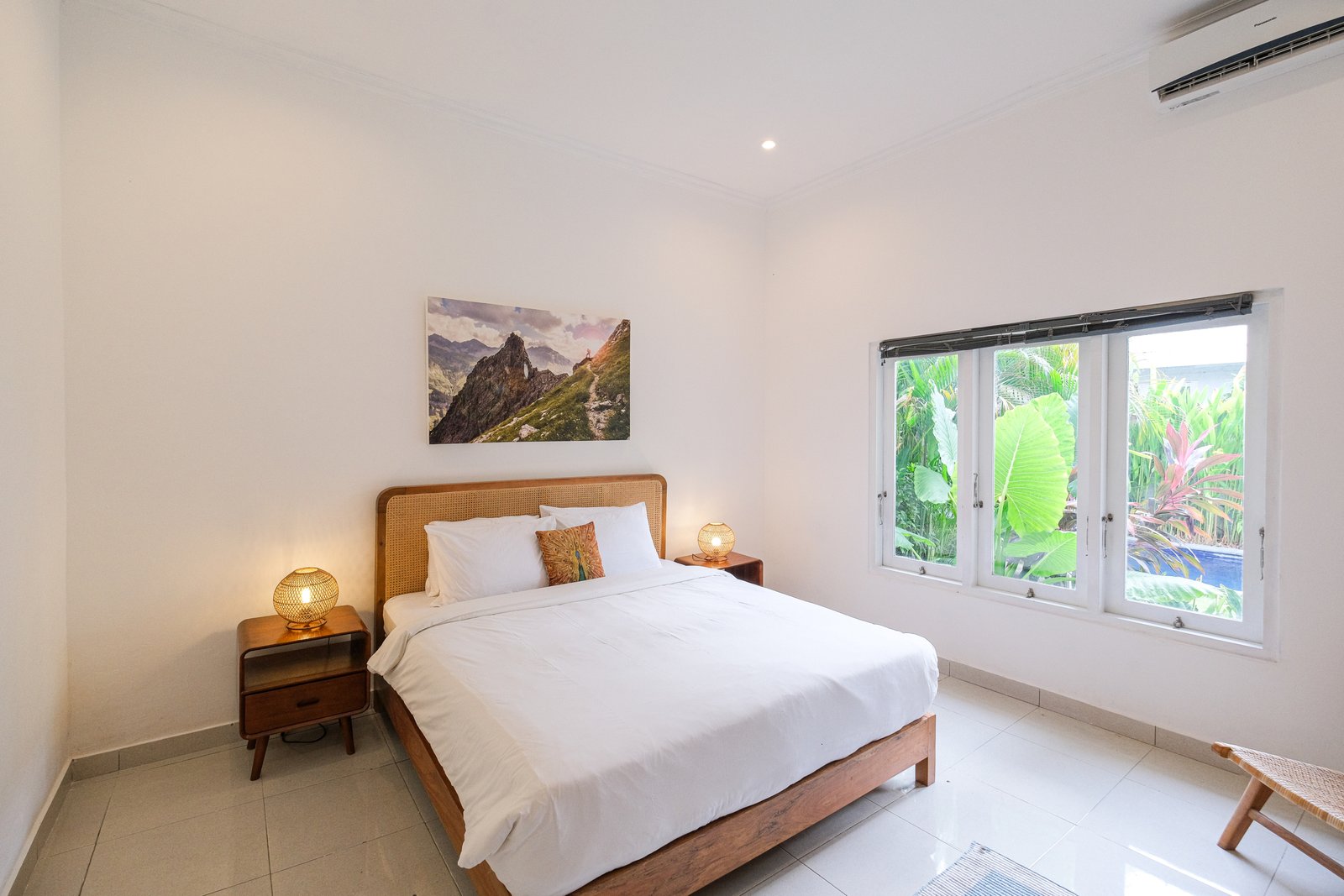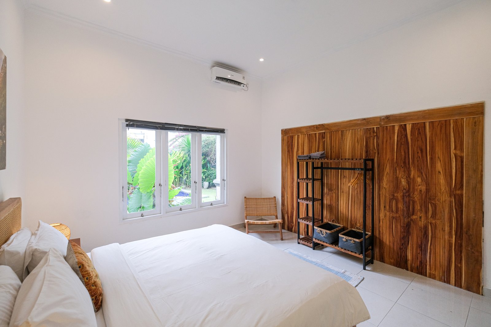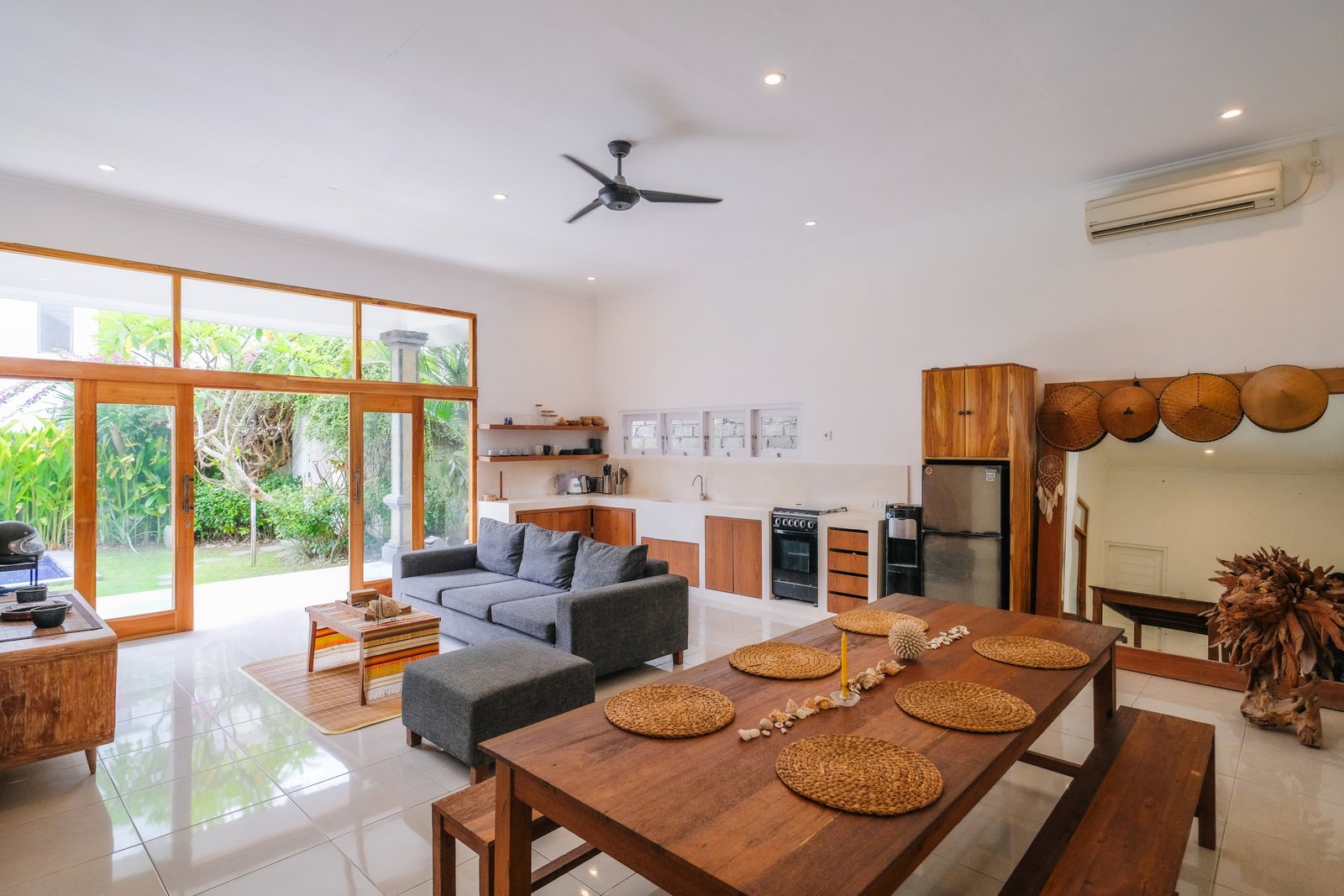 The villa features enclosed, air-conditioned living with a practical open-concept layout and a lush outdoor garden with a private pool.