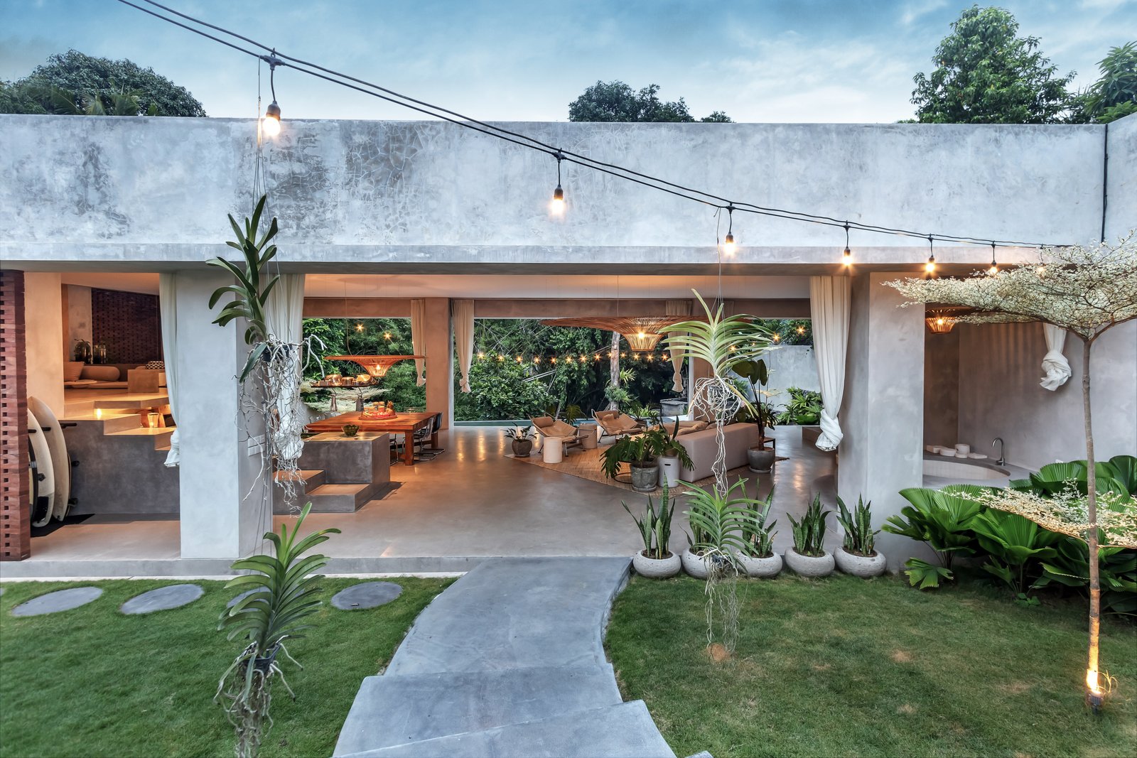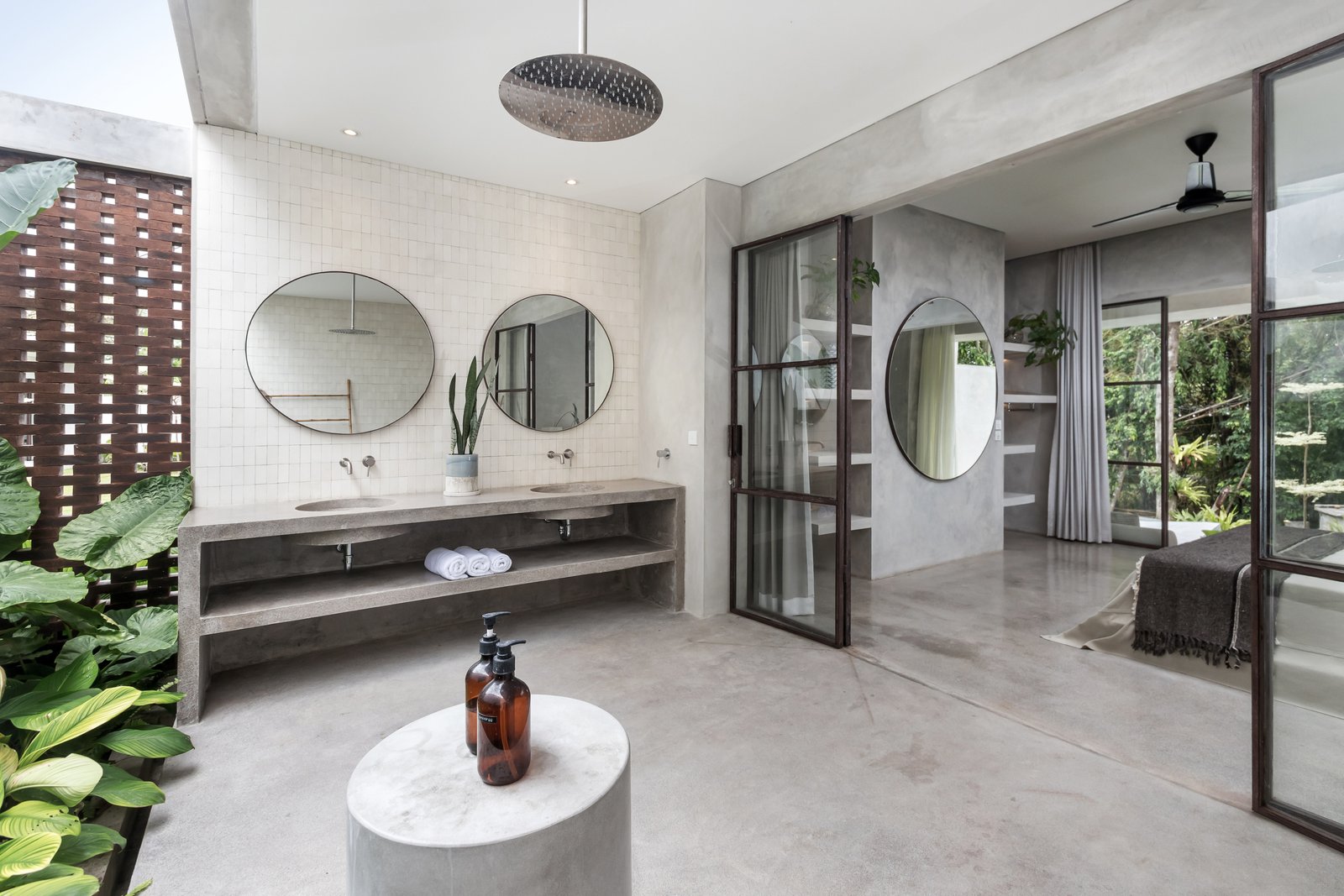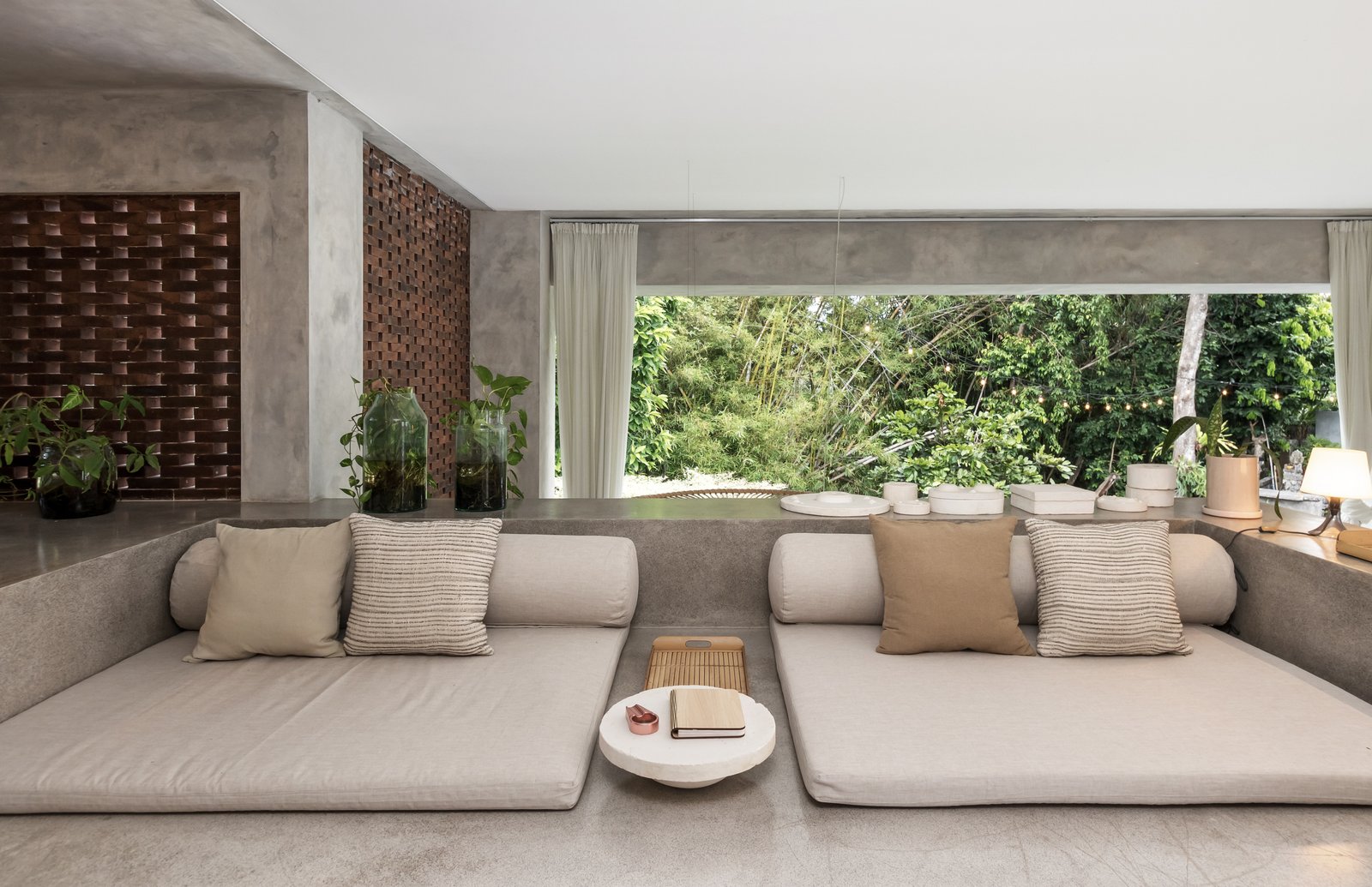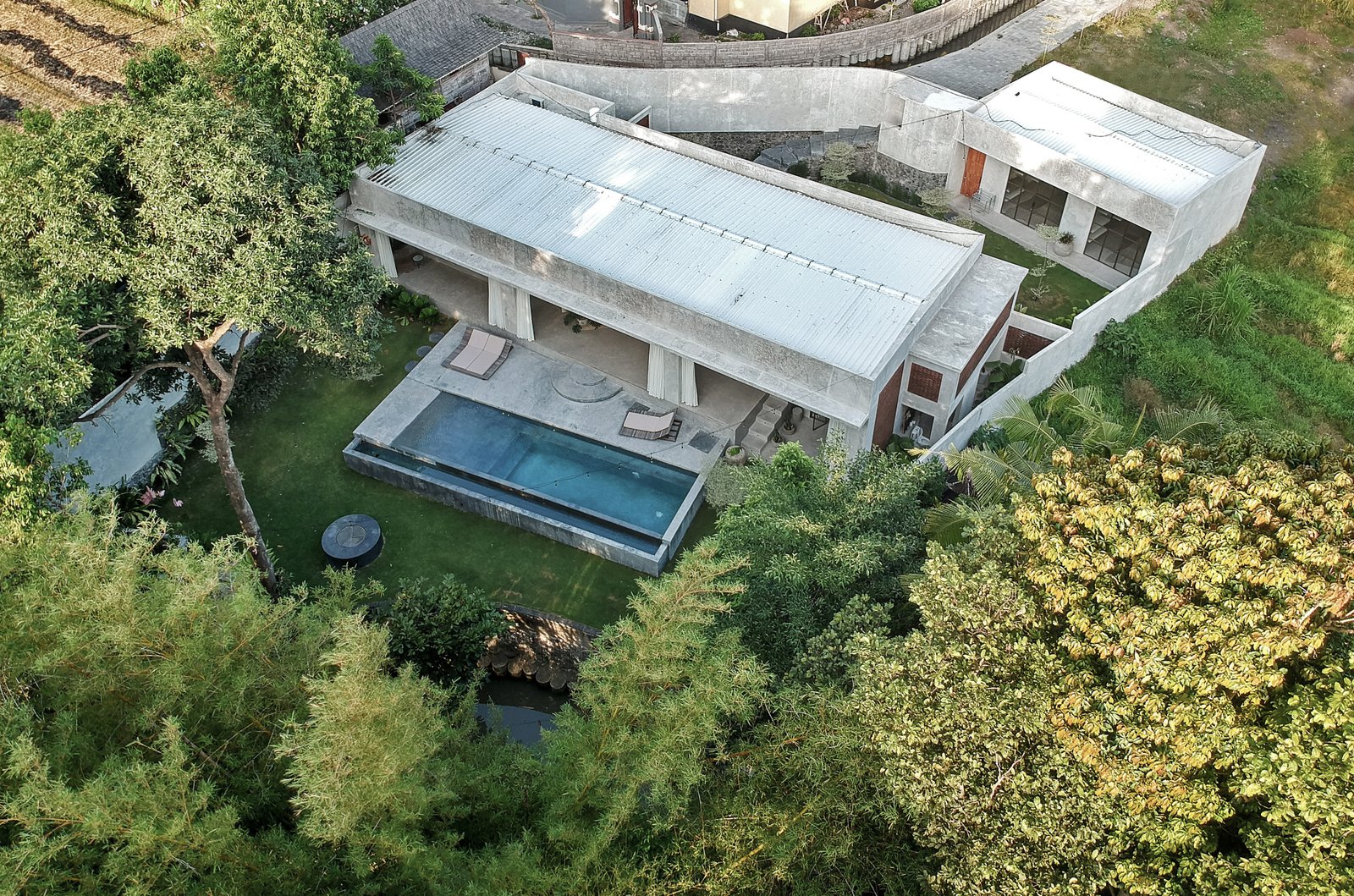• Tropical brutalist architecture with exposed concrete finishes