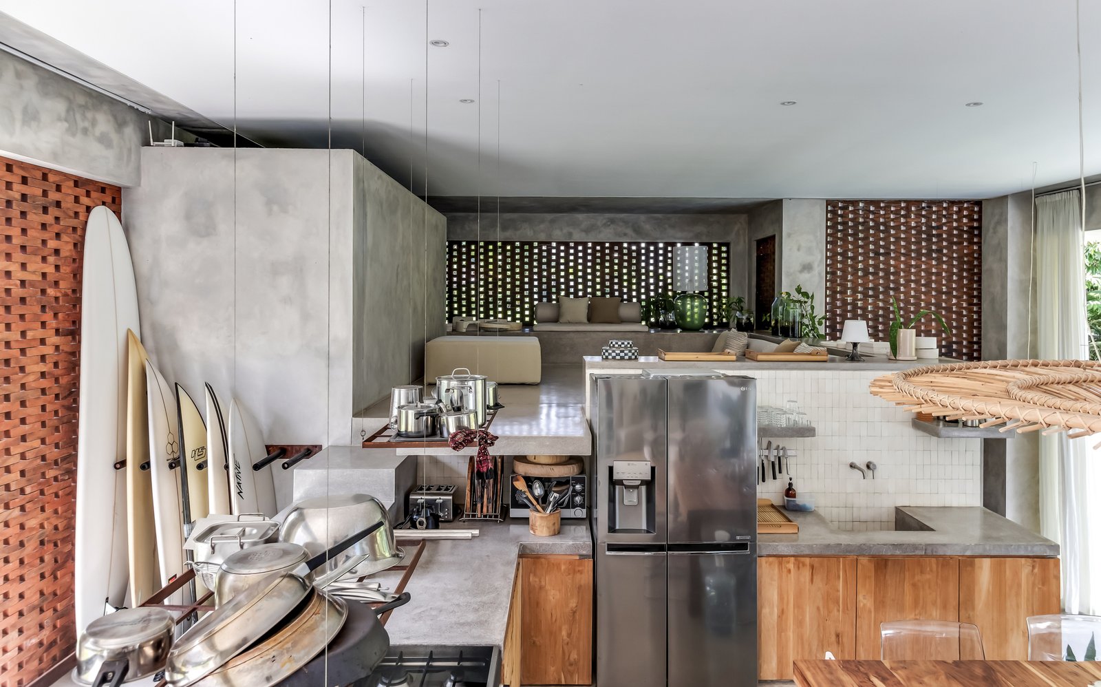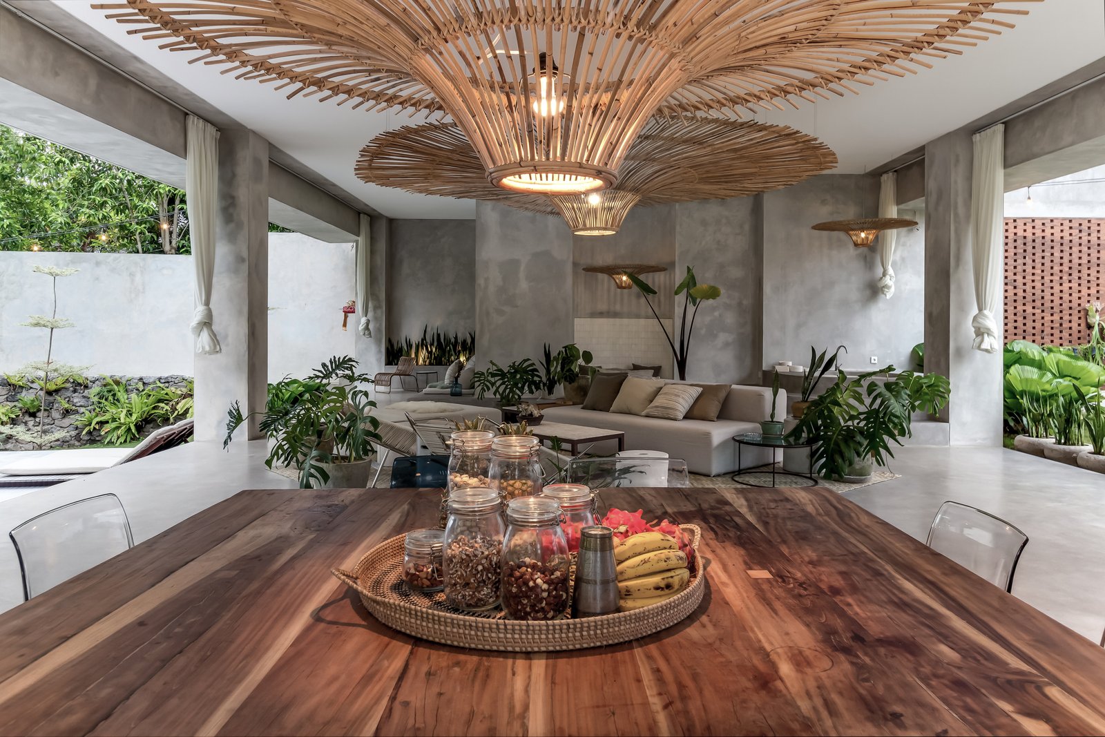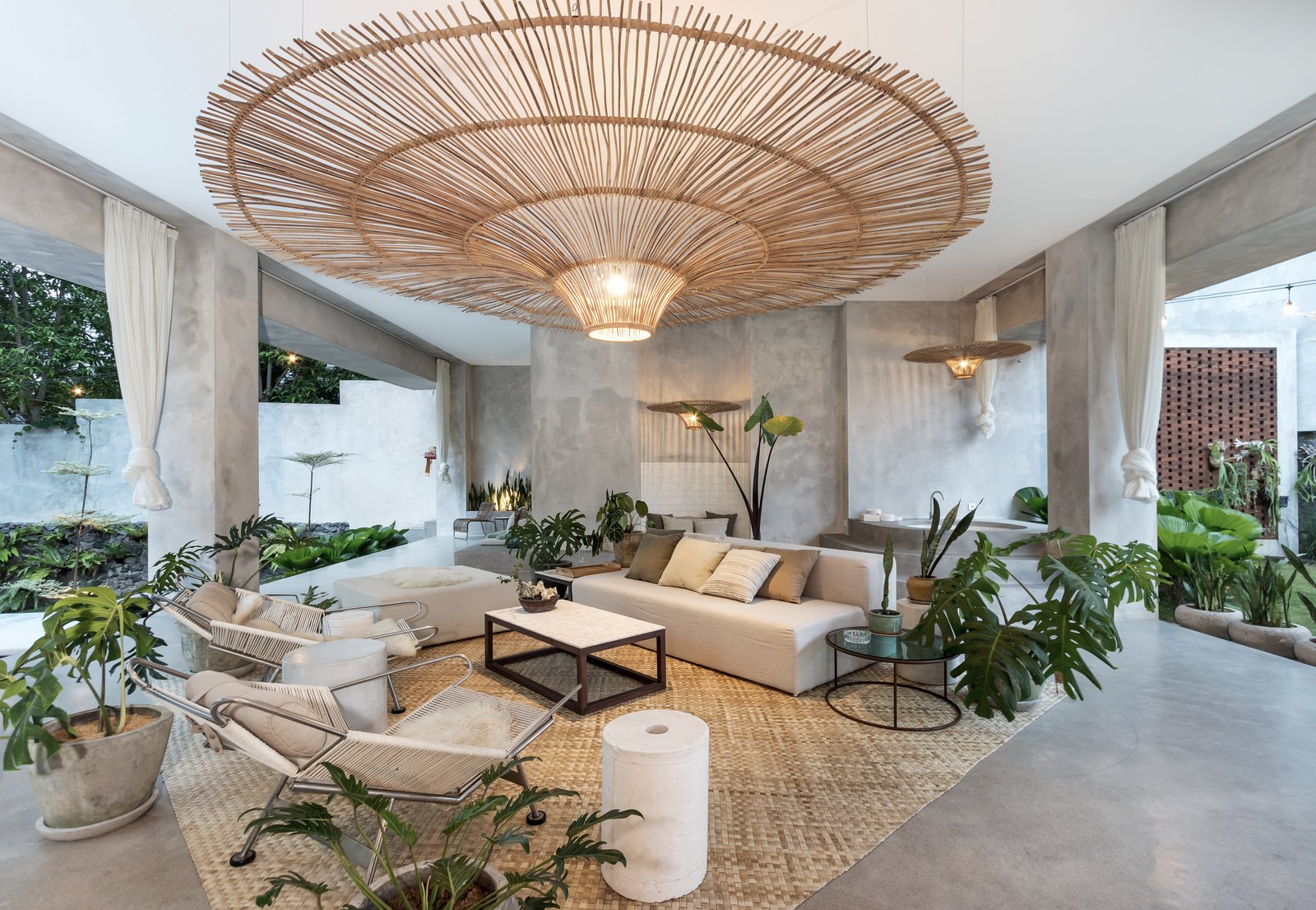 • Tropical brutalist architecture with exposed concrete finishes
