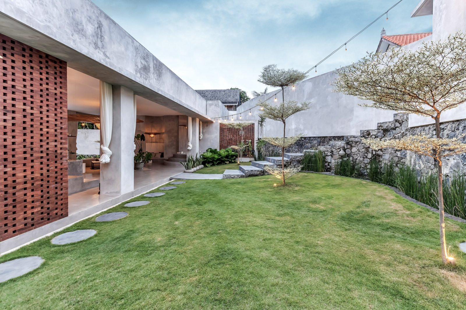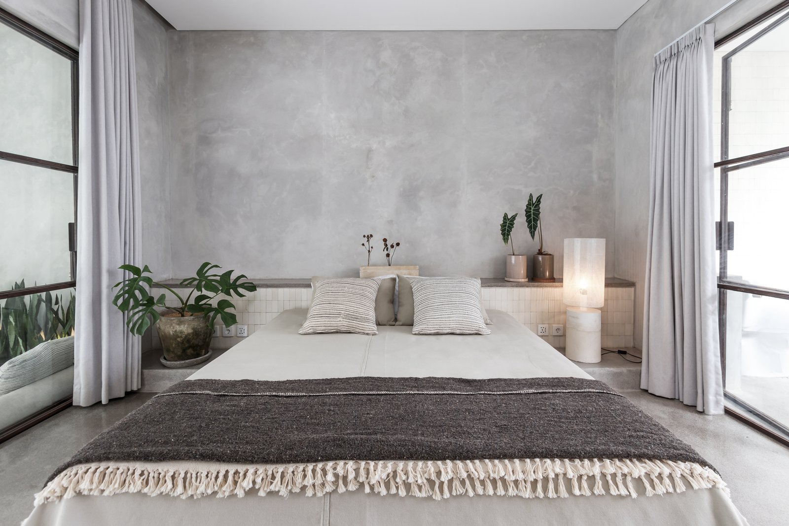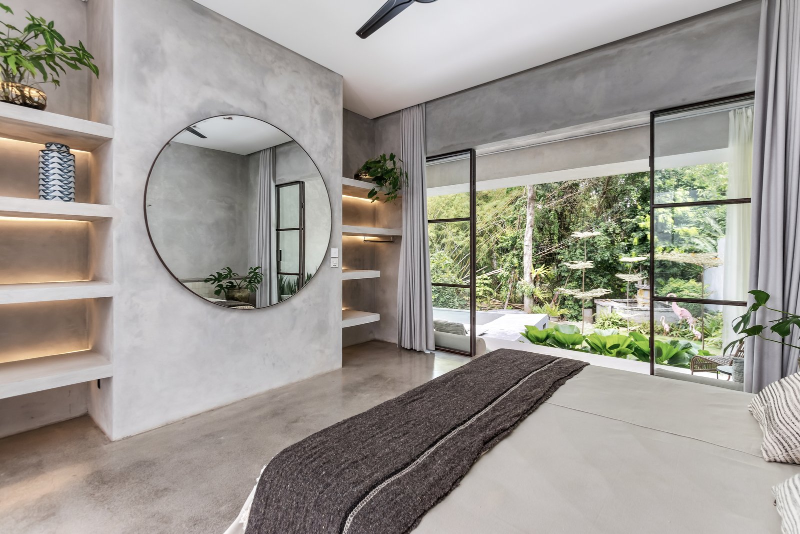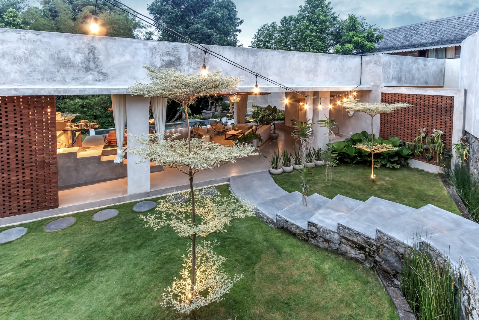 • Tropical brutalist architecture with exposed concrete finishes